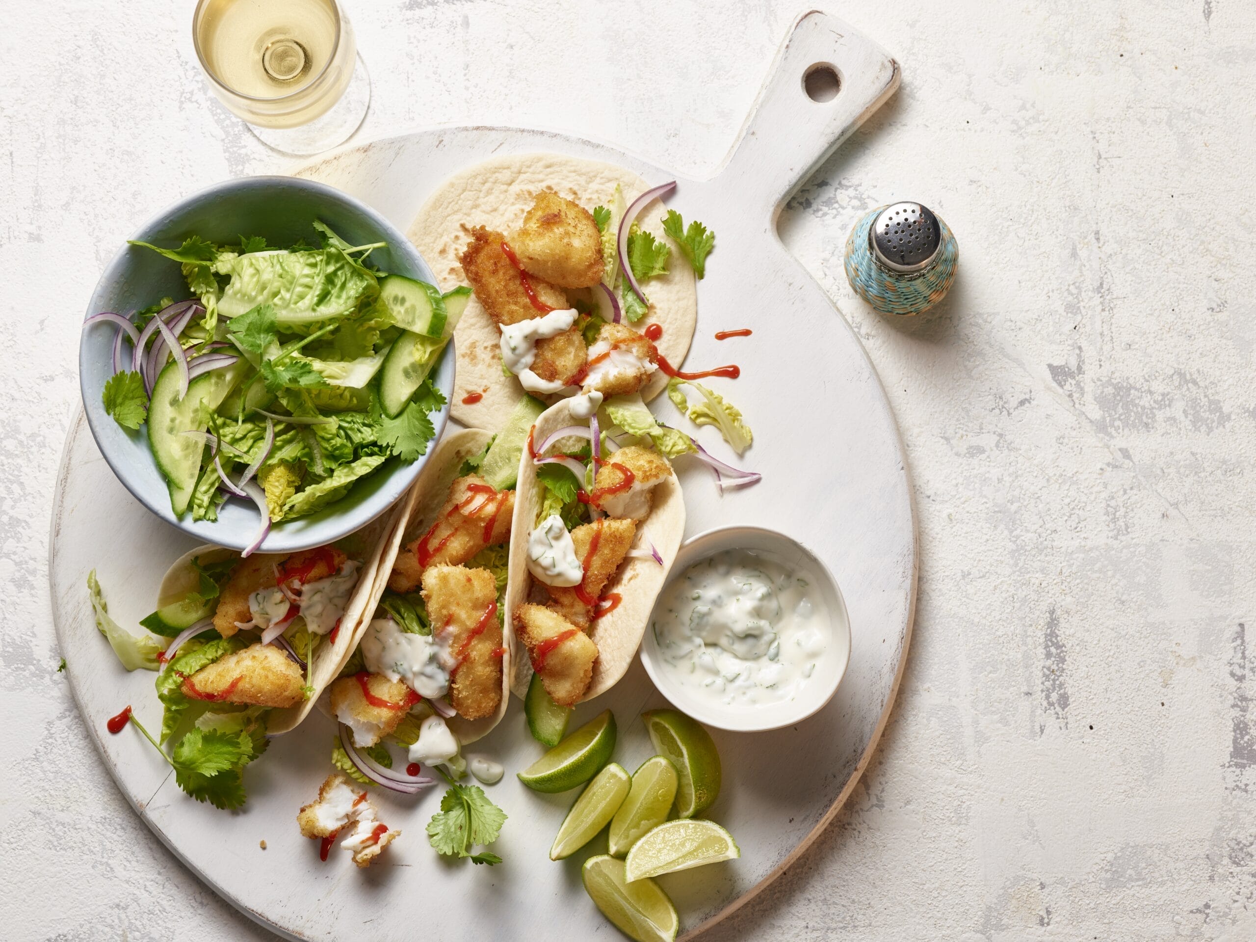 4. To serve, warm the tortillas, fill with a little of the salad, some of the fish and then spoon over the lime mayo. Add a drizzle of chilli sauce and serve with lime wedges.