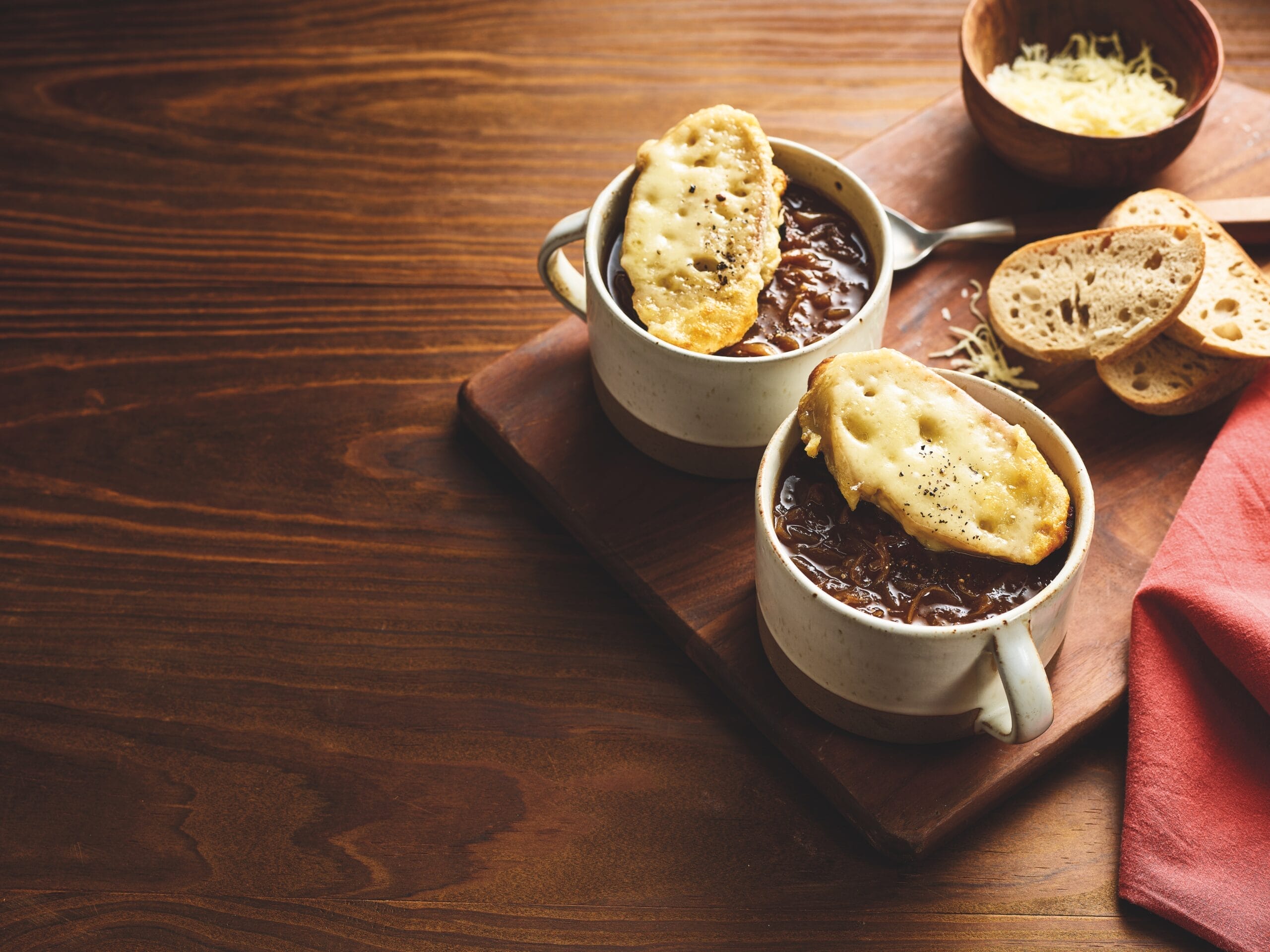 FRENCH ONION SOUP WITH CHEESE CROUTONS