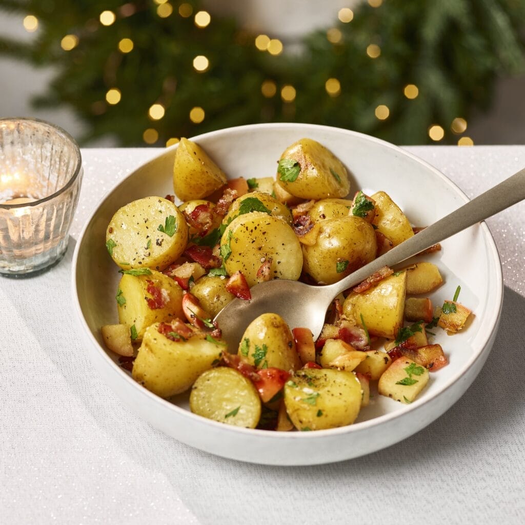 2. Add 50g chopped smoked streaky bacon and fry for 2-3 minutes until nicely browned. Add 1kg new potatoes that have been cut in half with 200ml vegetable stock, place a sheet of baking parchment over the top and cover with a tight-fitting lid. Gently cook for 20 minutes until tender.