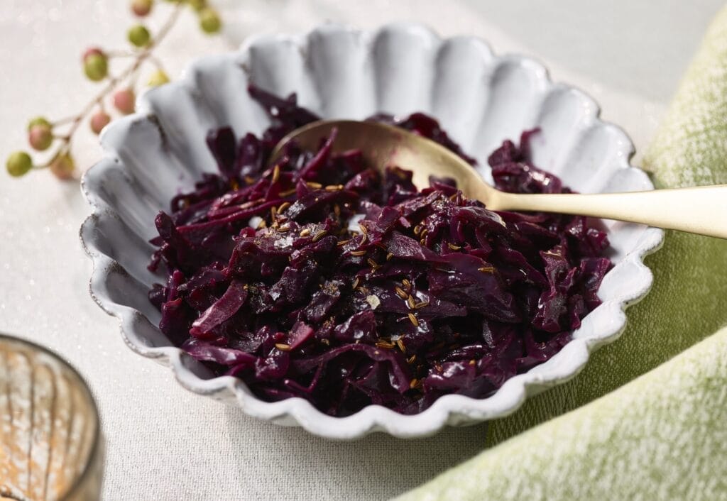 1. Heat 25g butter until melted, add 1 tsp caraway seeds and cook for 2 minutes until aromatic. Stir in 1 halved and finely sliced red onion, 900g finely shredded red cabbage, 50g soft brown sugar, 3 tbsp cider vinegar and 200ml red wine.