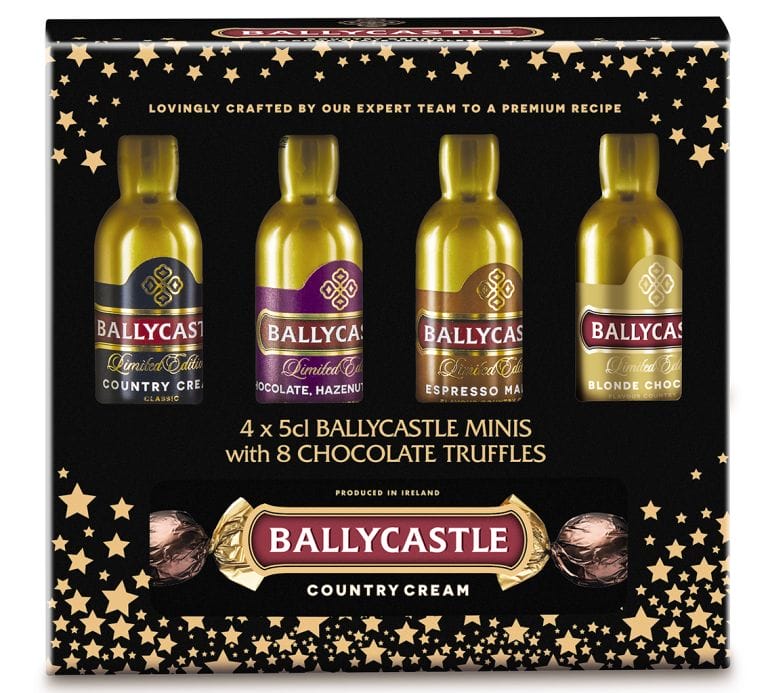 Ballycastle Minis with 8 Chocolate Truffles has Classic Country Cream; Chocolate, Caramel and Hazelnut; Espresso Martini; and Blonde Chocolate. £9.99 4 x 5cl Aldi